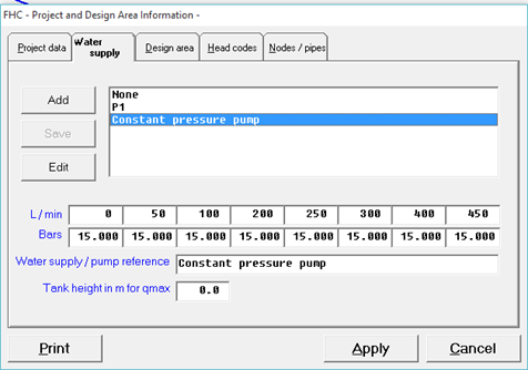 You may wish to model the water mist system against a known water supply you can do this in FHC but adding a pump curve to the ‘Project data -> Water supply’. In this tab you can add and edit water supply curve by providing 8 data points. The example below shows a constant pressure pump providing 15 bars.
