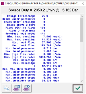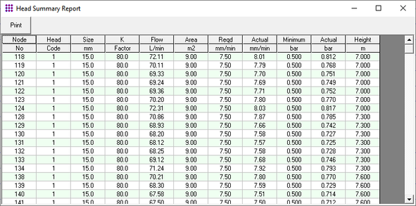 You can select any of the column headings such as Node, Flow, Pressure etc. and the column will be sorted in ascending or descending and will alternate each time you make a selection. Some items may be highlighted in RED text which is a indication that the item is outside its scope. An example would be a head with a Actual pressure or 0.85 bar and the minimum pressure is specified as 1.00 bar as the Actual pressure is below the minimum pressure the Pressure will be in RED text. The same method is used for the required design density and the actual design density.