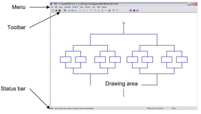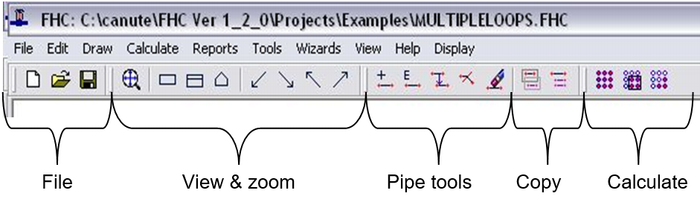 The most frequently used commands are grouped together in logical sections on the Tool bar such as file, view, pipe tools (Add, Edit...), Copy & Calculate.