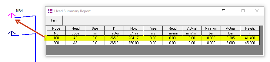 We have also used another technique which is helpful to clarify the FHC drawing, the horizontal pipe between node 170 and 180 has been drawn as 1m in length however the actual length of this pipe is only 0.3m so we have subtracted 0.7m by using the added length with a negative number (1.0 – 0.7 = 0.3m). You will often find that you can simplify the drawing by using the horizontal pipe length and added length together this is especially true for risers and hydrant systems but you can only use this command for horizontal pipes as FHC must know the correct length of vertical pipe so it can calculate the static pressure.