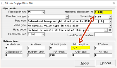 The following image bellow is showing the EDIT pipe dialogue box and highlighted in the red is where you will enter the pressure and flow requirement in the +AF and +AB text boxes.