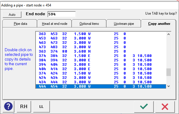 The copy another tab displays a list of all the pipes previously entered into the hydraulic model. You can select any of the previously entered pipes and by double clicking and the information will be automatically transferred to the pipe you are adding.
