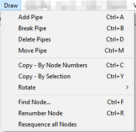 The draw menu contains the commands which will allow you to add and manipulate the pipes in your FHC project. You will see that many of the most frequently used commands can be accessed by the using the shortcut code or from the draw toolbar.