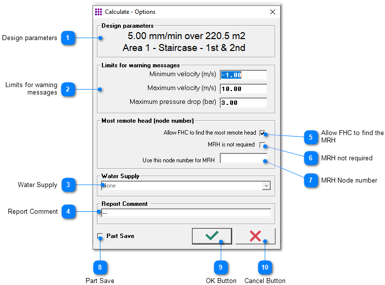 You can select and deselect the Part Save option. If it is selected then when the calculation has been completed you will be prompted to save the project with a new file name and only the heads which you are selected and calculated will be saved in the new project file. This is useful if you have a project with a large number of heads and you wish to save the operating heads such as the most remote area or the most favourable area. This makes it much easier to return to the calculations the heads already selected.