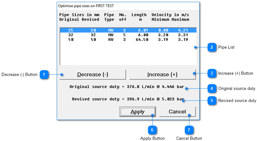 You can select individual pipe sizes and then increase or decrease in size and the revised source duty will be displayed if you wish to revise the new pipe sizes in the system press the apply button otherwise cancel close the dialogue and return you to the calculation summary.