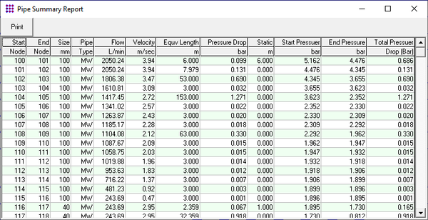 The pipe summary will list all the hydraulically significant pipes in the calculation which are any pipes where water is flowing.