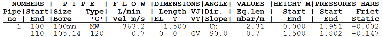 This pipe is a vertical rise 1.5 m in length, it has a gate valve and the internal diameter is 105.14mm. The pressure at node 100 is 1.951 Bar and the pressure at node 110 is 1.802 Bar. As the pipe is vertical we have the static gain of 1.5m x 0.098 = 0.147 Bar and the pressure loss in the pipe is 0.002 Bar. Therefore, the total loss in this pipe is the pressure loss due to friction plus the pressure required to overcome the difference in height this is equal to 0.147 + 0.002 = 0.149 Bar.
