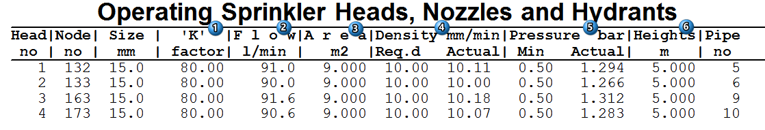 This section details each sprinkler head nozzle or hydrant which is operated in the calculation as below: