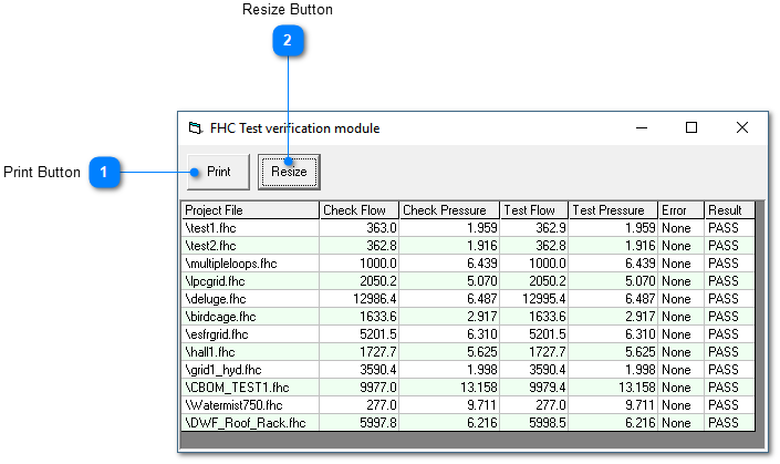 The Test verification module will run thought a number of predefined FHC projects and will check that your FHC program has been installed and calculating correctly. Some AHJ's require that systems are calibrated as part of their quality audit and the report which you can print out is ideal documentation for the tractability. If you find that you do not get a pass result in each of the tests as below we would recommend the following: