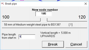 Enter a node number which have not been used the system say 105 and we also need to give the length of pipe from the start node [100], for a stop valve 1m will be a good value press the Break button to complete the action and you should see a new node number 105 has been added.