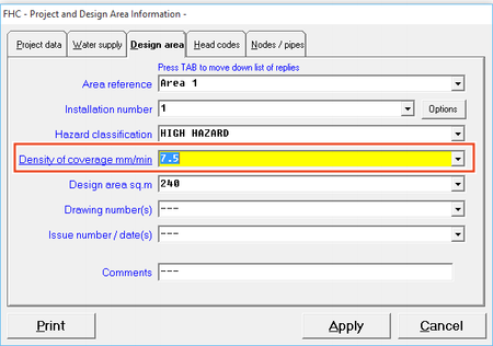 When we start an new FHC project we are required to enter some basic information in the FHC Project Data you will see below that the 'Density of coverage mm/mim' is Underlined this is telling you that what you enter into this field will affect the calculation. In this instance we have entered 7.5 mm/min which will now become the default design density for all the sprinklers heads on this project unless we specified differently in the Add or Edit pipe commands.