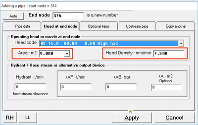 Each time we add a sprinkler head into the FHC hydraulic model we need to specify the actual area the head is covering we enter this number into the text box Area - m2. We can also enter the head design density but we do not need to do this if we have already specified it in the FHC project data as this will be the default design density for the project and all heads.
