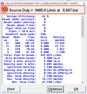 The calculation summary provides you with detailed information about the calculation but the most important part is in the top line marked (1) above which is telling us that the source pressure for the system is 3485.8 lpm @ 5.647 bar. Source pressure is the minimum amount of flow and pressure which is required for the system to operate correctly given design parameters which we have entered.