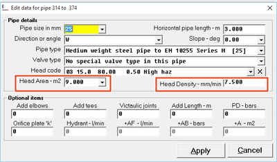 If we have a project where we are required 12.5 mm/min design density and we had only a few sprinklers with 5 mm/min design density then we could set the default design density in the FHC project data 12.5 mm/min and then for the few heads which required the lower design density can be specified when we use the add or edit the pipe command.