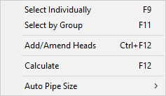 Once we have made a calculation we may wish to amend the number of heads and make a further calculation we can do this by using the commands above to 'Select by the group' or Select individually or alternatively we can use the 'add / amend heads' command on the calculate menu [Ctrl+F12]. Once you selected this command with the mouse you can select and unselect heads as you require when you have made the changes you require press the [F12] key to recalculate. You can keep using this command until you have correctly found your most remote and most favourable sprinkler heads in your hydraulic model.