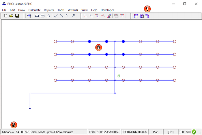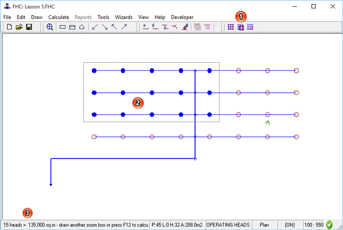 If you open lesson 5 in FHC and ensure that you have the plan view selected [F2], then select the 'select by group' [F11] command you now need to draw a marquee tool around the heads you wish to select you do this by pressing the left hand mouse key and holding whilst drawing the area, once you have the head selected released the mouse key, the head you selected will now turn blue as shown below (2). You can keep using this tool to select and unselect the heads as you require. You will see on the status bar (3) will be updated to show you the number of heads you have selected and the total area for those heads. If the area is not shown this is because you are not entered the head area for each the heads and you may need to amend your hydraulic model.