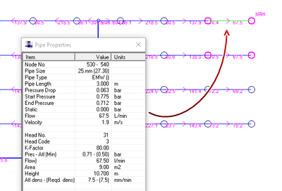 Now that calculation has been performed new information will be attributed to each pipe in the system which we can interrogate by using the pipe properties command [Ctrl+V] we can also use the context menu by clicking the right hand mouse button in the drawer area, we can then select various properties. In the example below we have selected pipe flow so the flow and direction is being shown on each pipe. You will also notice below one other heads is marked MRH this is the most remote head in the installation so we now know the critical path for the water flow from the water source is to this point in the system. You will also notice that an additional 3 heads around MRH have also been marked, FHC tries to correctly find the 4 most remote heads in the system which is a requirement of EN 12845