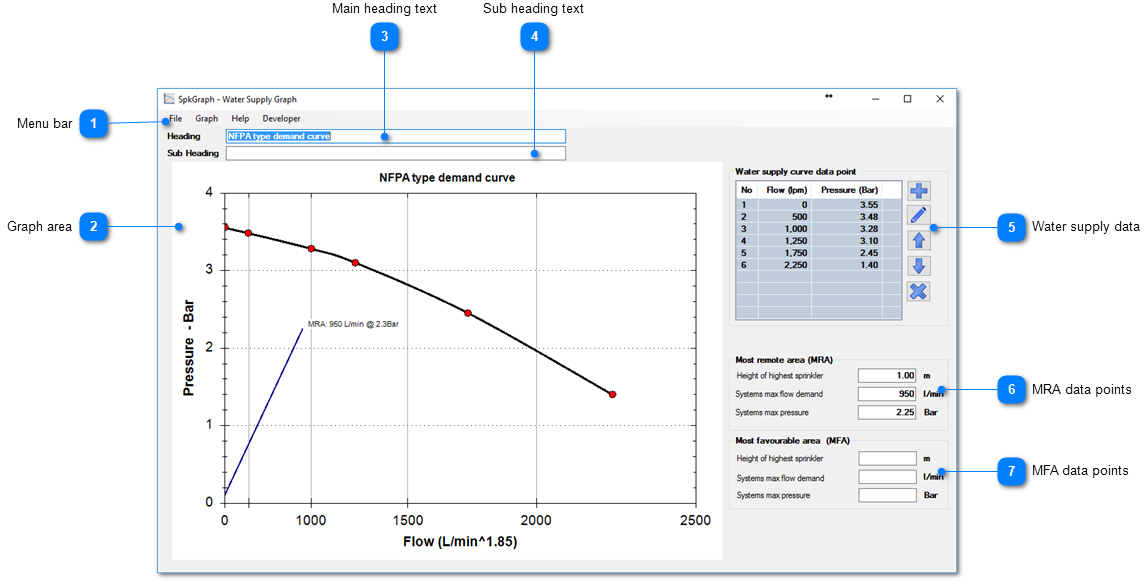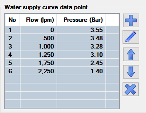 With this set of commands you will enter the data points for your water supply curve. The first data point must have zero flow and the maximum supply pressure. You must have a minimum of three data points entered before spkGraph will display a curve and we would recommend that you supply at least five data points. |