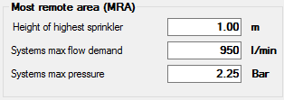 For the most remote area you will needs to enter the Height of the highest Sprinkler or nozzle , the system maximum flow demand and maximum pressure. |