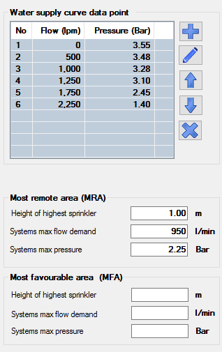 You will need to supply the most favourable area the source pressure and flow together the height a high sprinkler the same area. In the example below we have used 3.000 m for the height of highest head 200 L/min @ 2.3 Bar and the Maximum flow demand has been calculated to be 233 L/min